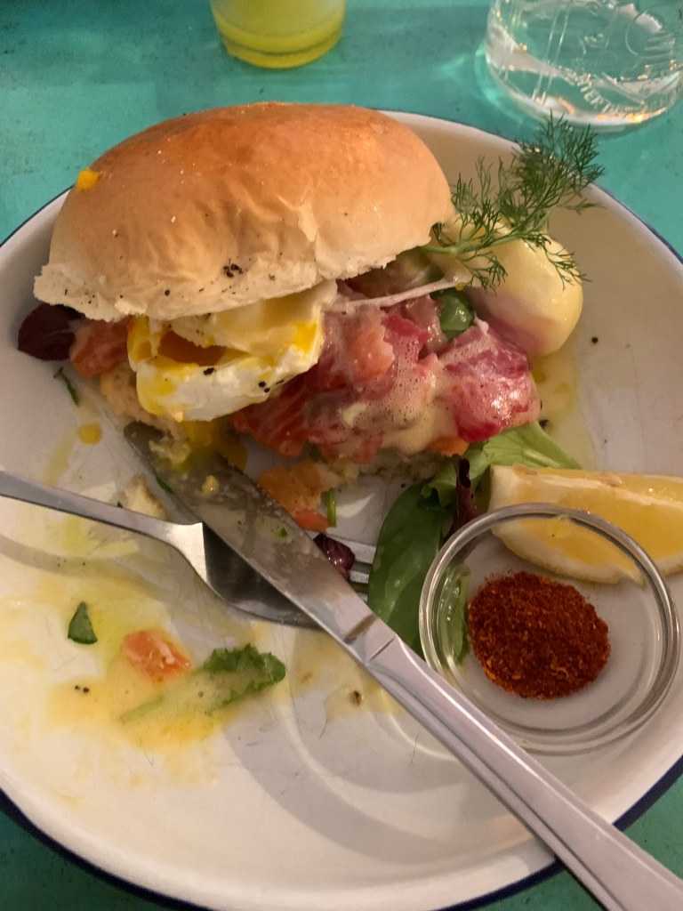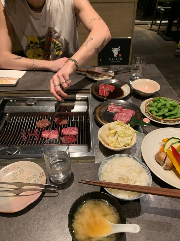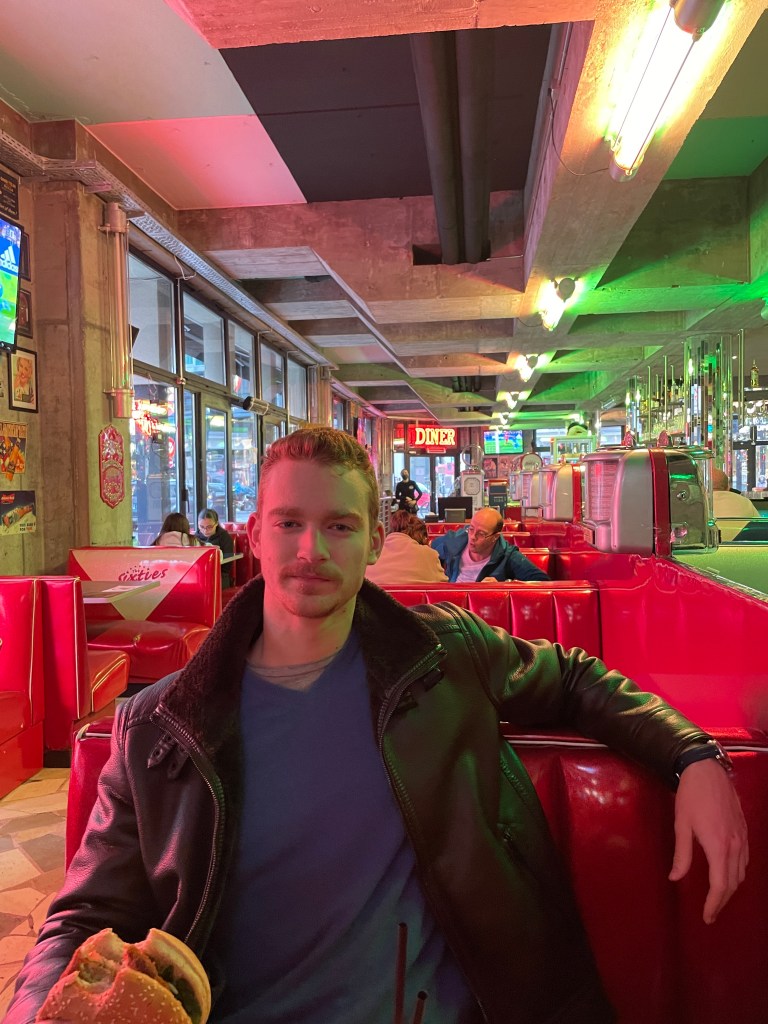 At the “Sixties Diner” in Berlin, Germany, chowing down a burger! My friends don’t think so, but I believe the leather jacket and the arm on the seat makes me fit in the decade perfectly!Artwork? Maybe. Delicious? Absolutely. Brioche French toast, accompanied with fig, pear, pecans, pistachios, mint, mascarpone, a touch of ice cream, and special sauce that was beyond me. When I say this might just be the best french toast I’ve ever had, I mean it. Ordered at the ABC Brunch club – Berlin.A unique spin on the classic breakfast item, eggs benedict. Along with avocado and freshly cured salmon all wrapped neatly into a warm bun, all I have to say is kudos to the chef. The saffron chili on the side was delicious when sprinkled on. I meant to take a picture before I took a bite, but I just couldn’t help myself…whoops. Ordered at the ABC Brunch Club – BerlinDuring our stay, when Ben and I were walking in Prenzlauerberg searching for dinner, we just so happened to pass by this small eatery with a cloth covering for a door. Intrigued, we walked inside and were immediately asked if we had a reservation. Unbeknown to us, apparently this “small eatery”, was a high class Japanese barbecue, and the reservation list was booked for the rest of the week. Thankfully, acting as stupid American tourists, we charmed the waitress with my next to nonexistent knowledge of the Japanese language and she sat us to this table after a few minutes. (It definitely wasn’t because somebody couldn’t make their reservation). Although none of the meat was kosher, grilling various meat and vegetables was very fun experience. Ushido Japanese BBQ – Berlin